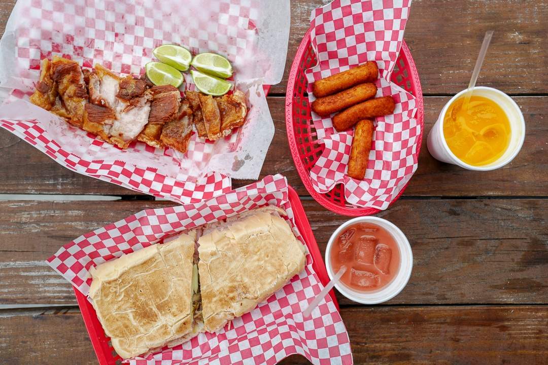 Vi bestiller en Cuban Sandwich, chicharrones, fritert cassava, mango- og guavajuice.