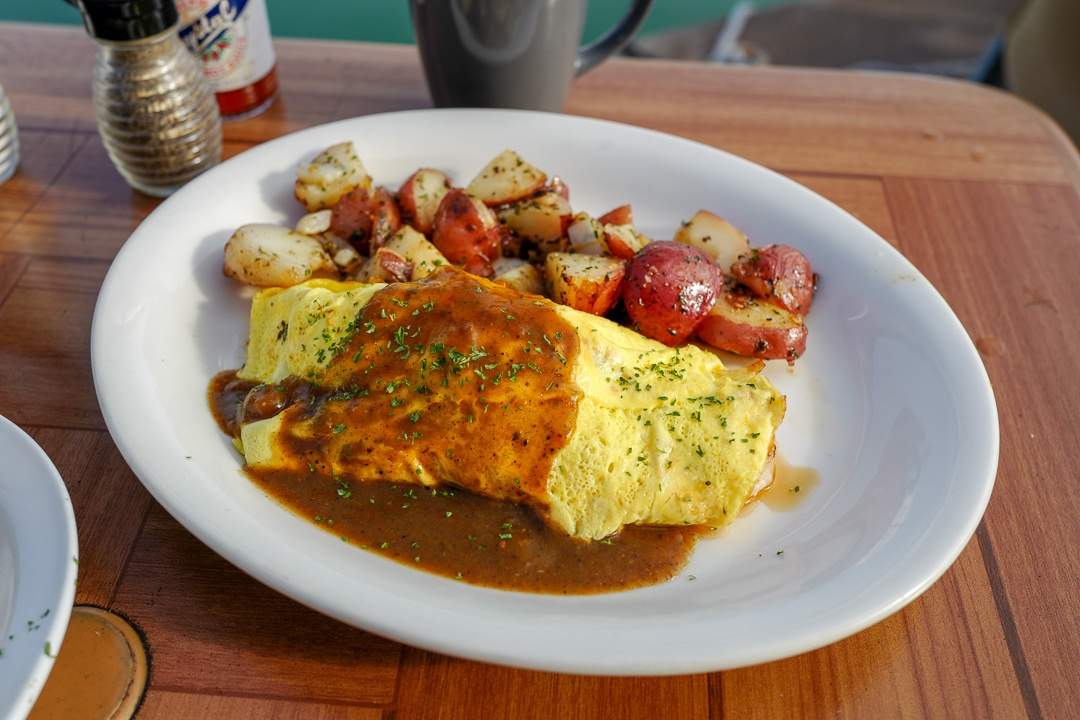 Vi klarer endelig å fjerne øynene fra vannet et lite sekund og ut fra den alt for fristende frokostmenyen er det to retter som står ut: Eggs benedict med asparges og ferskt krabbekjøtt er en av rettene vi bare må ha. Den andre er Johns oppfinnelse: eggchilada med reker, bacon, tomater, ost, løk pakket inn i en eggecrêpe servert med en nydelig poblanosaus på siden. Begge rettene serveres med deilige pannestekte poteter.