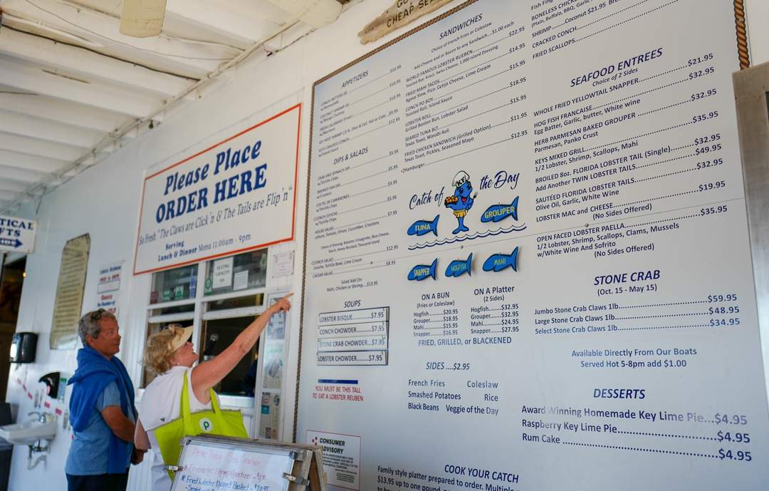 De er også kjent for sin lobster roll og stone crab – Krabbeklørene som du kan spise fra 15. oktober til 15. mai. Greia med stone crab er dette: Fiskerne kan fjerne en klo per krabbe og så slippes krabben ut i vannet igjen. Kloen gror ut igjen og derfor anses dette krabbefisket bærekraftig. Keys Fisheries er stedet lokalbefolkningen og til og med folk helt fra Key West (som ligger en halvannen times kjøretur fra Marathon) kjøper krabbene sine fordi de er av veldig god kvalitet og pris.