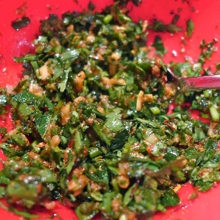 Finhakk en neve bladpersille og en neve korianderblader.