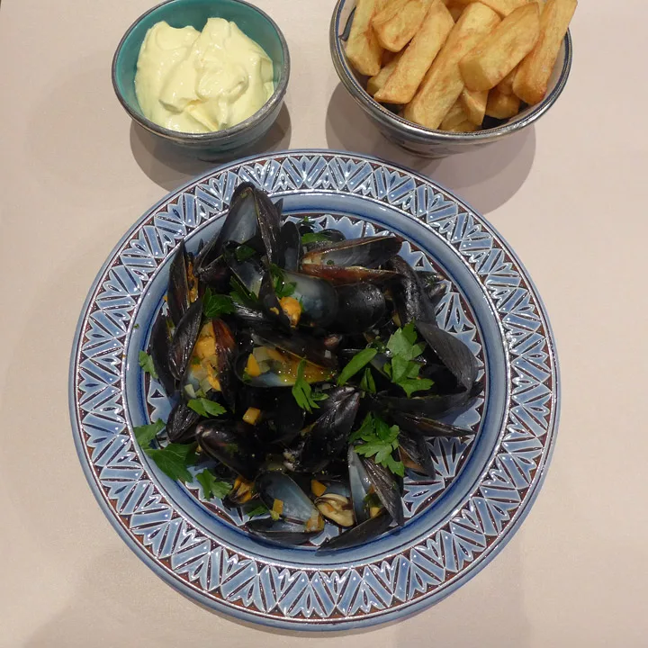 Denne blåskjellretten inneholder marokkanske smaker. Og fordi Marokko har en sterk fransk innflytelse, har jeg laget pommes frites til retten og en helt fantastisk sitronmajones. Passer som hånd i hanske, så det så!