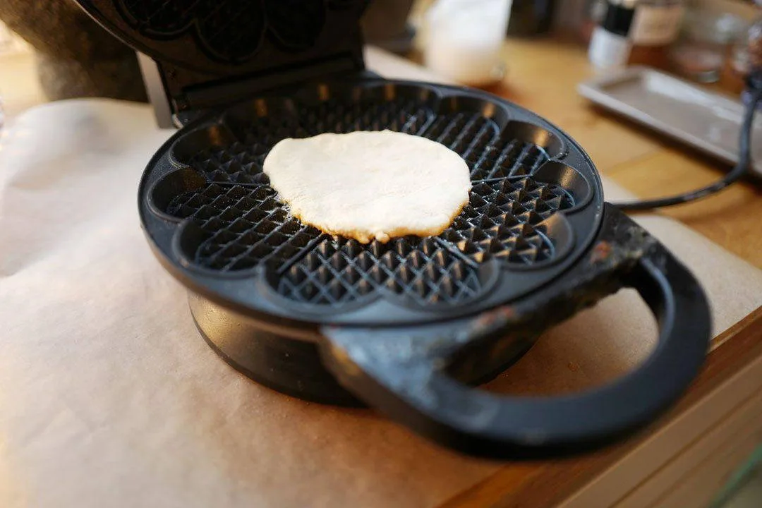 Jeg prøvde meg litt frem med deigen. Pannekakene skal stekes i panne, men det kan da ikke være noe i veien for å lage dem i vaffeljernet, vel? Jeg elsker flerbruk av kjøkkenutstyr og vaffeljernet brukes flittig til masse annet enn vafler her i huset. Det er for eksempel det perfekte verktøyet når du skal steke ostesmørbrød. Nå ville jeg lage marokkanske pannekaker i vaffeljernet også.