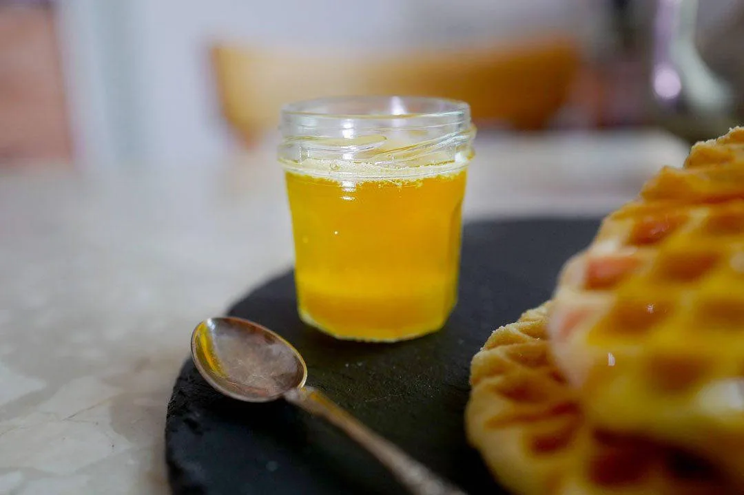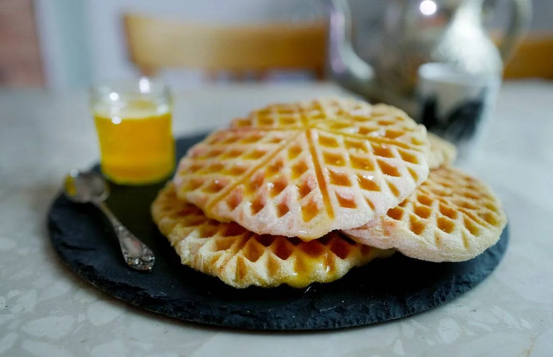 Ha honningsmøret på vaflene og nyt. Bruk kniv og gaffel, sa unngår du søl.