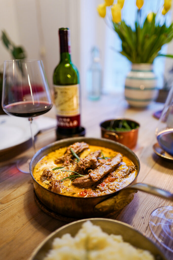 Vi serverte gryten med potetmos og kokte aspargesbønner. Et strålende valg!