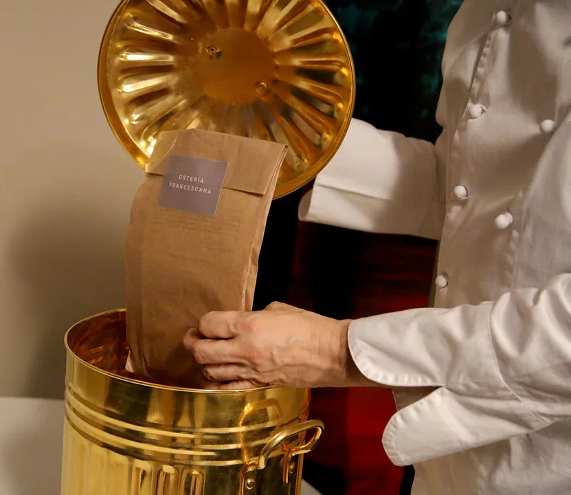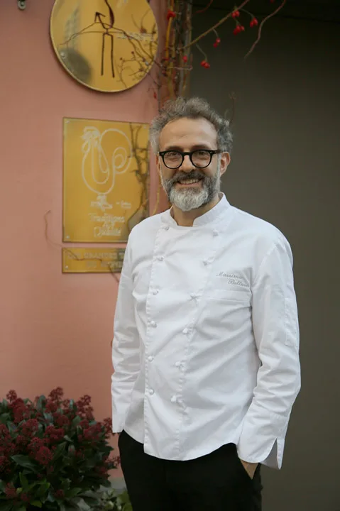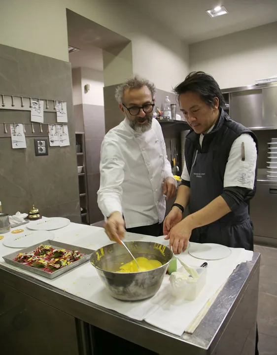 Massimo overvåker rettene som skal ut. Foto: Helle Øder Valebrokk.Massimo Bottura på kjøkkenet. Foto: Helle Øder Valebrokk.På Osteria Francescana har det aldri jobbet nordmenn. Ennå. Foto: Helle Øder Valebrokk.Massimo med den symbolske søppelbøtten inne på hans kontor. Søppelbøtten representerer matavfall og i den ligger hans bestemors oppskrift på brød. Massimo har et suppekjøkken i Milano der han serverer mat til hjemløse. Han er ekstremt opptatt av å ikke kaste mat for hvis vi fortsetter med det vil ikke verden ha nok mat i fremtiden, sier han. Foto: Helle Øder Valebrokk.