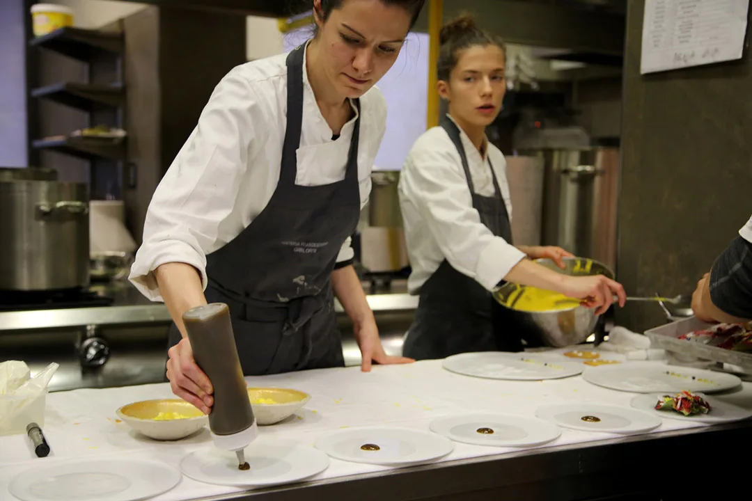 Jeg får være med som fotograf og jeg får lov til å ta bilder på kjøkkenet under service. «Hold deg langs veggen, så går det bra», sier Massimo Bottura. Gjett om jeg skal. Her skal ikke jeg bli kastet på hue og ræva ut på grunn av at jeg er i veien. Det er en drøm for meg å være her og se de kjente rettene bli til mens Massimo går og sjekker at alt er opp til hans standard og kvalitet.