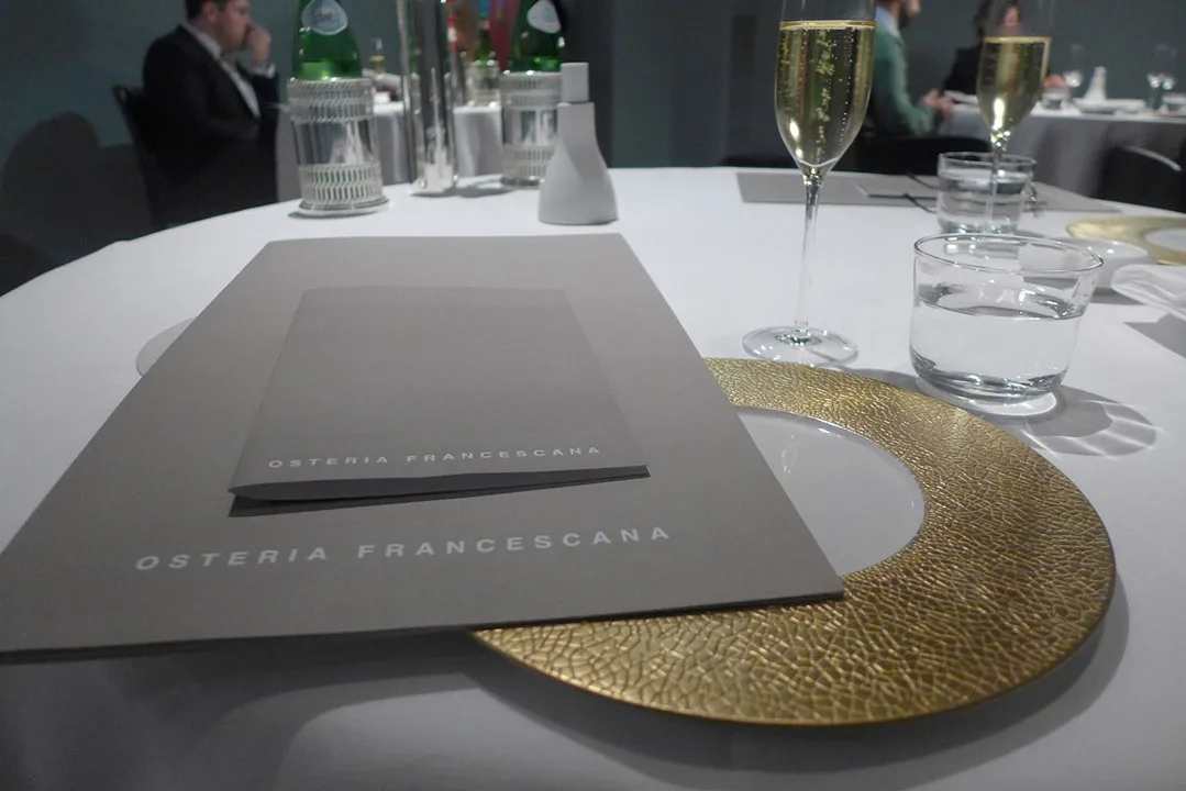 Tilbake på Osteria Francescana. Forventningsfulle gjester står utenfor. Vi blir sluppet inn klokken 20.00 og ført til bordet vårt.