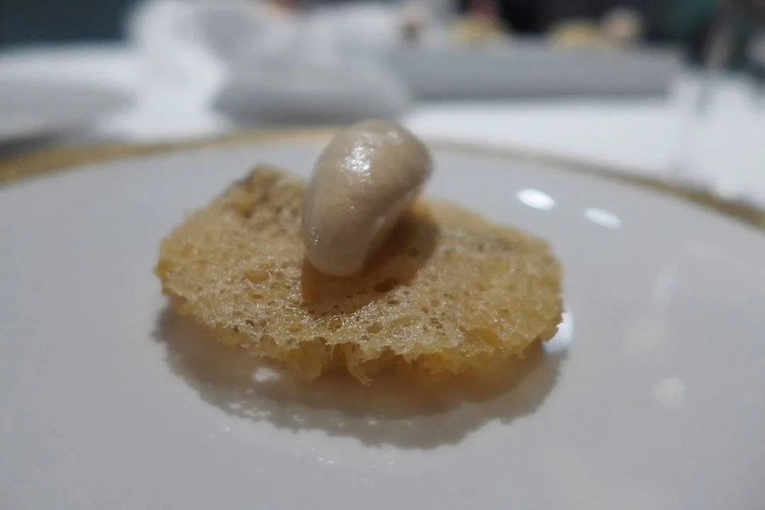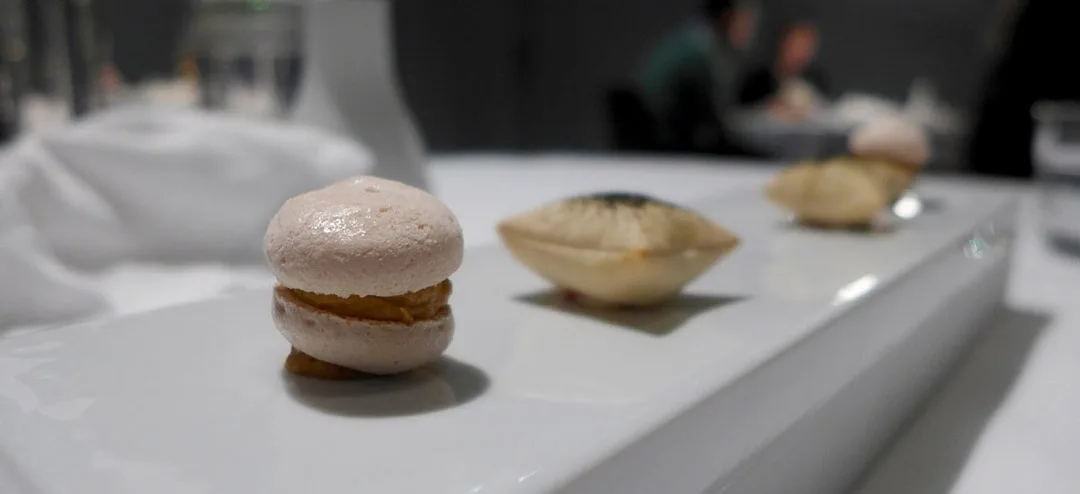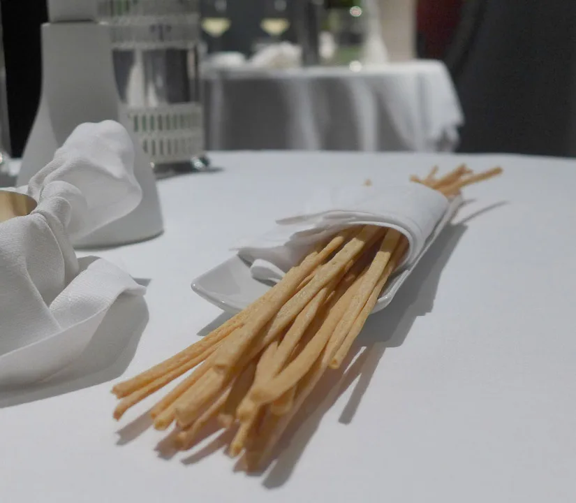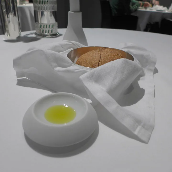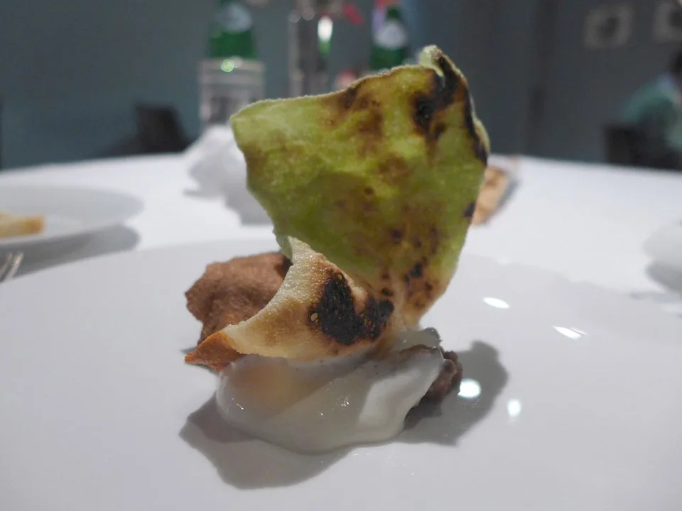 Fish & Chips. Elvefisk innbakt i potetskorpe med iskrem og eddik.Makron med kanin cassiatore (jegerens gryte.) og luftlette puter med fyll av noe jeg ikke helt vet hva var. Lyst il å lage kylling cassiatore? Her er min oppskrift.Yuzusake til første rett.Hjemmelagde grissini laget på olivenolje.Første rett: Østers med eple og verbenagranita. Dette var en frisk og nydelig start. Saken passet perfekt til sitruselementene i retten.Lett perlende vin fra Piemonte til neste rett.Sustainable and salvaged: Makrell, perfekt svineribbe, fennikel og en slags sylte. Med et lokk av safrangelé.