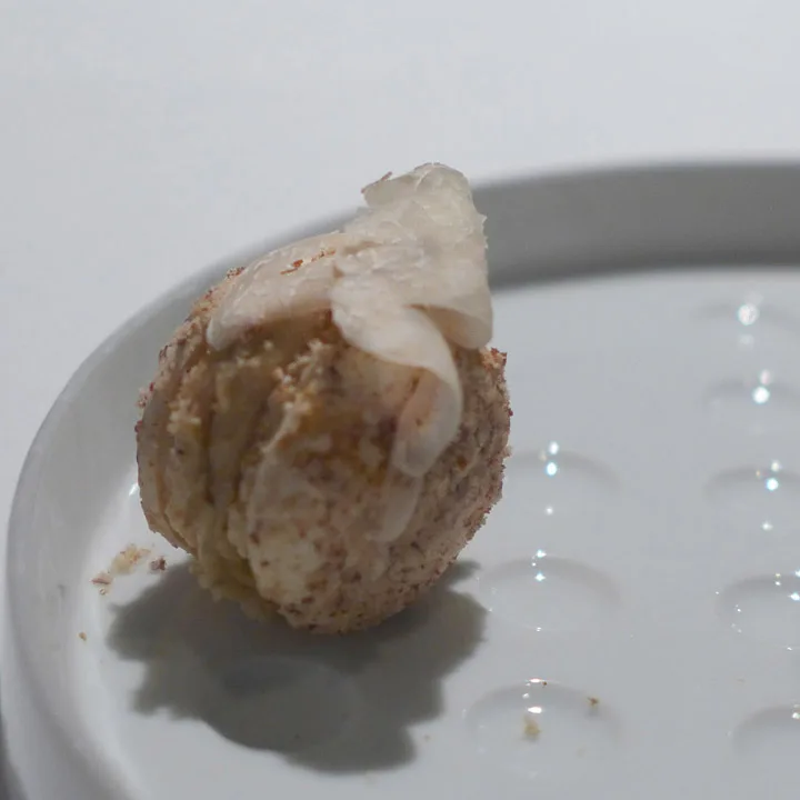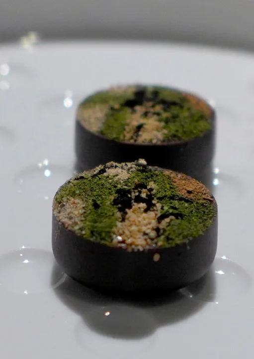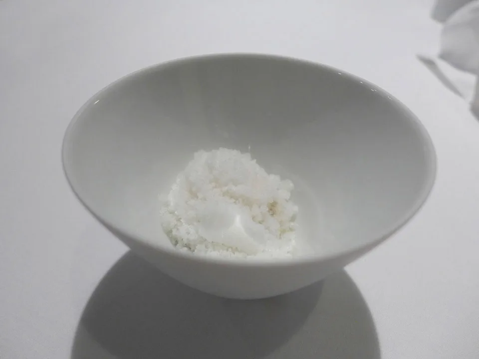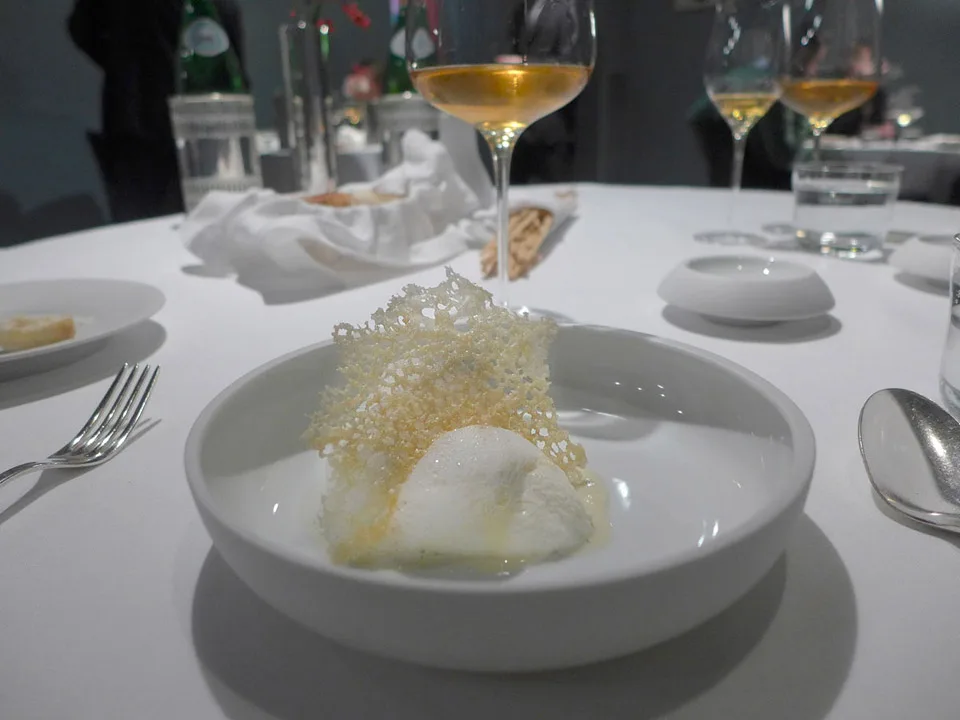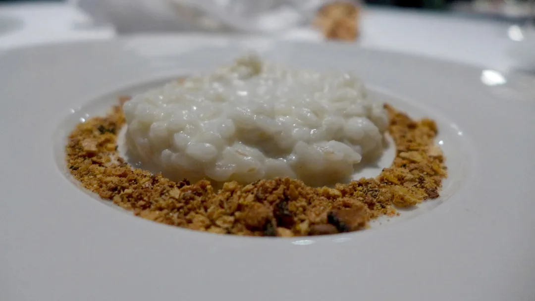 Polenta and rice in plaise of a pizza: Denne retten ble til etter at Massimo Bottura snakket med taxisjåfører som henter gjester fra Osteria Francescana etter måltidets slutt. Flere av gjestene har bedt taxisjåførene om å kjøre dem til nærmeste pizzasjappe fordi de ennå ikke er mette. Derfor lagde Massimo denne retten som skaper fornemmelsen av å spise en pizza. Risottorisen er kokt i parmesan. Under er en kraftig saus av ansjos og tomat og rundt ligger ristet polenta for å gi smaken av stekt pizzaskorpe. Dette er genialt! Og det smaker autentisk. Han har humor, han Massimo!