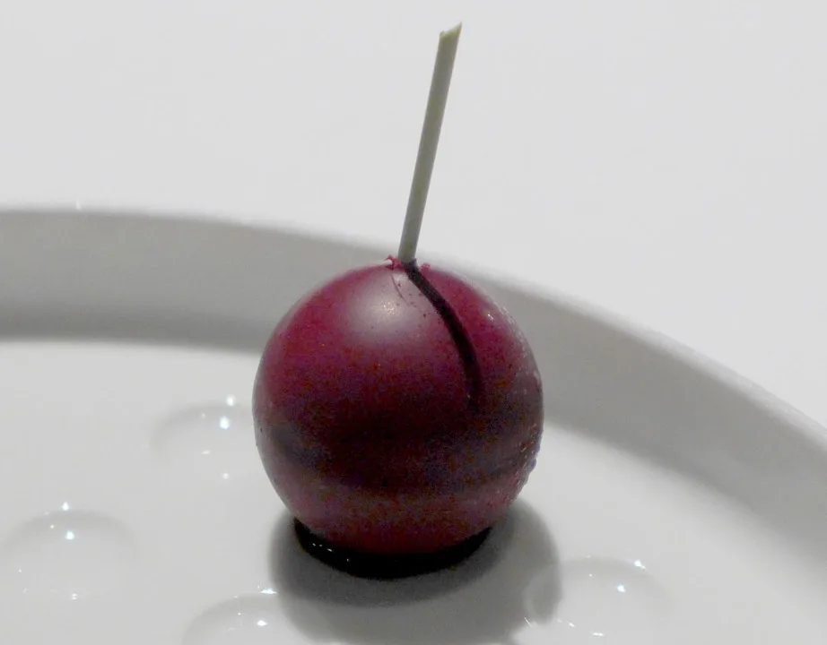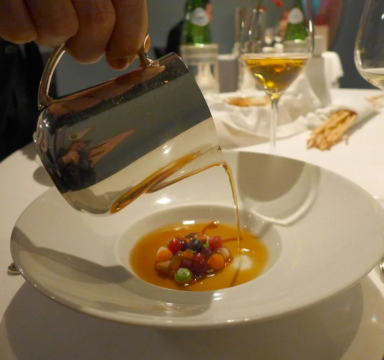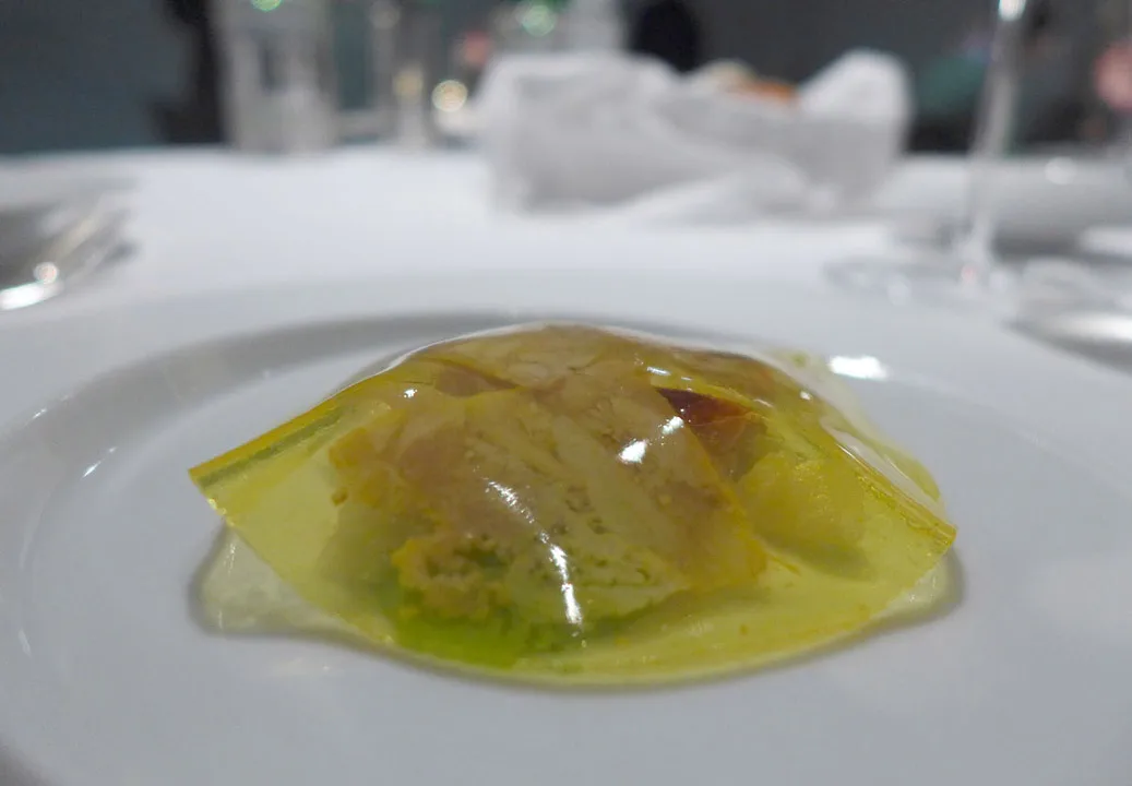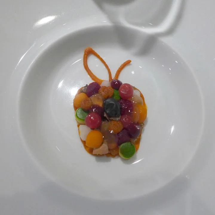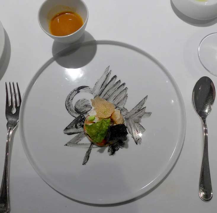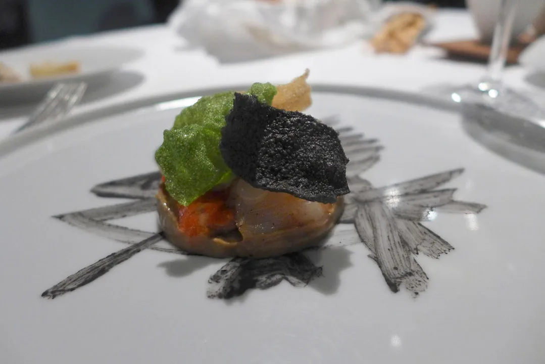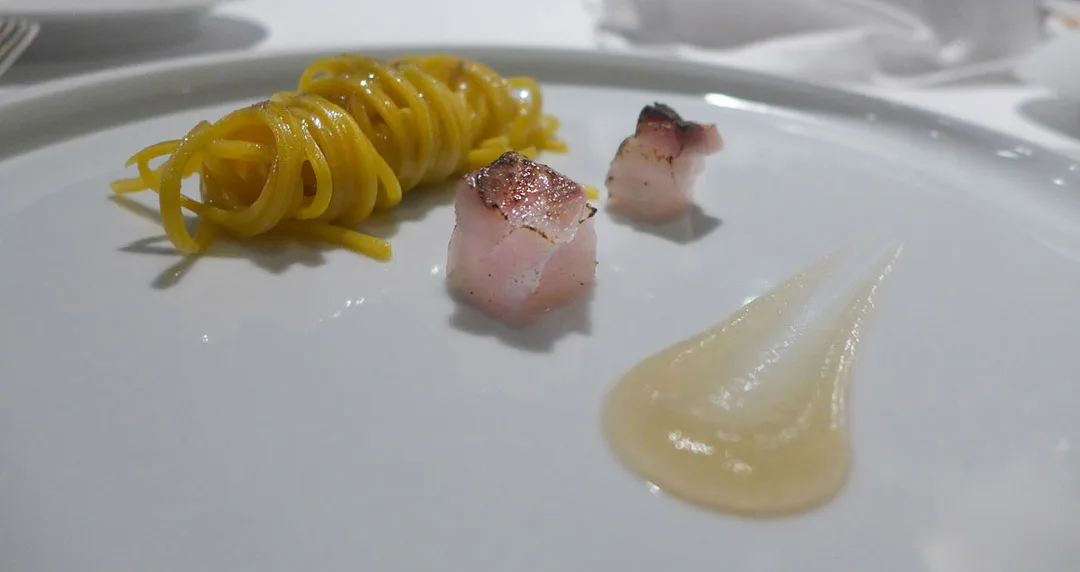 Gitarstrengpasta med lettgrillet amberjack (en fisketype) med røkt syltetøy av grønne tomater. En av mine desiderte favorittretter denne kvelden.Fiskesuppe på Massimos vis. Forskjellige teksturer av fisk og skalldyr servert med tre typer sprø tang og fiskesuppe ved siden av. Den smaker som en moderne bouillabaisse.Bildet av fisken er malt på fatet og kan spises.