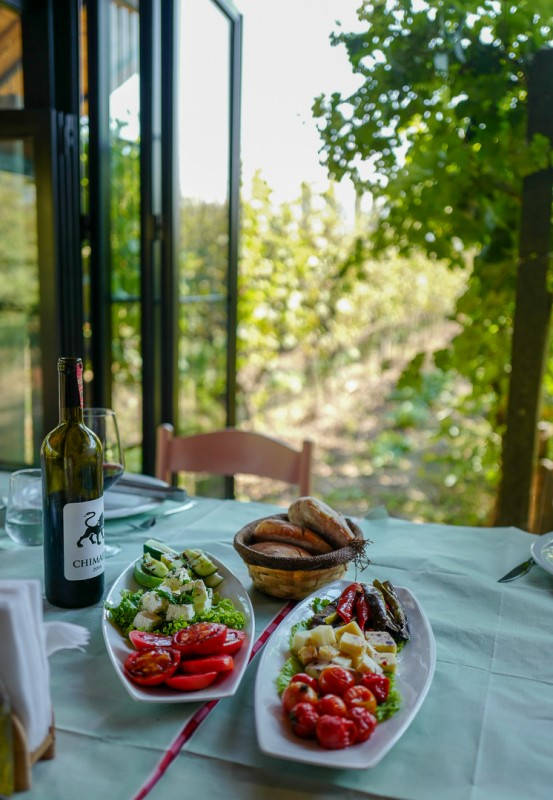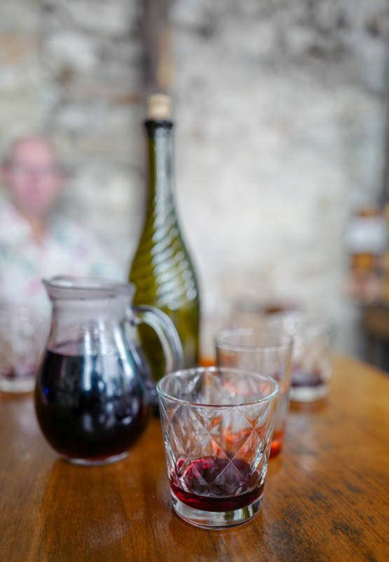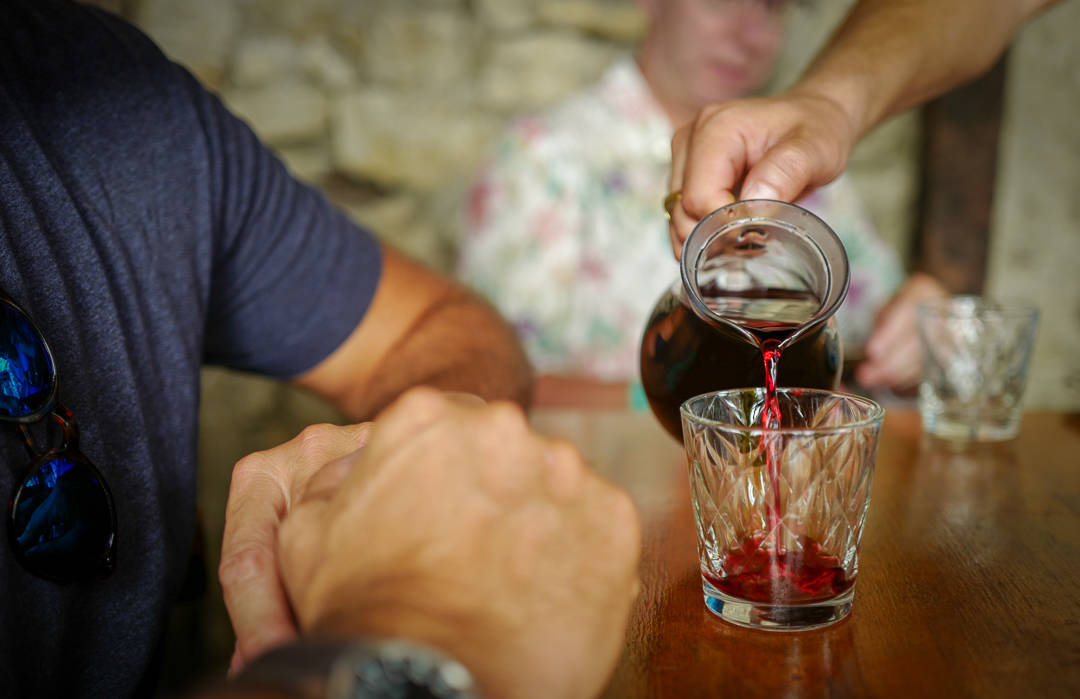 De serverer ikke øl, cola eller pommes frites, forteller Lili. Her er det kun nærproduserte ting som havner på bordet, som Babas (bestefar) rødvin, som er overraskende god. Vi får en halv karafel om gangen. – Den må være avkjølt i denne varmen, sier Lili.