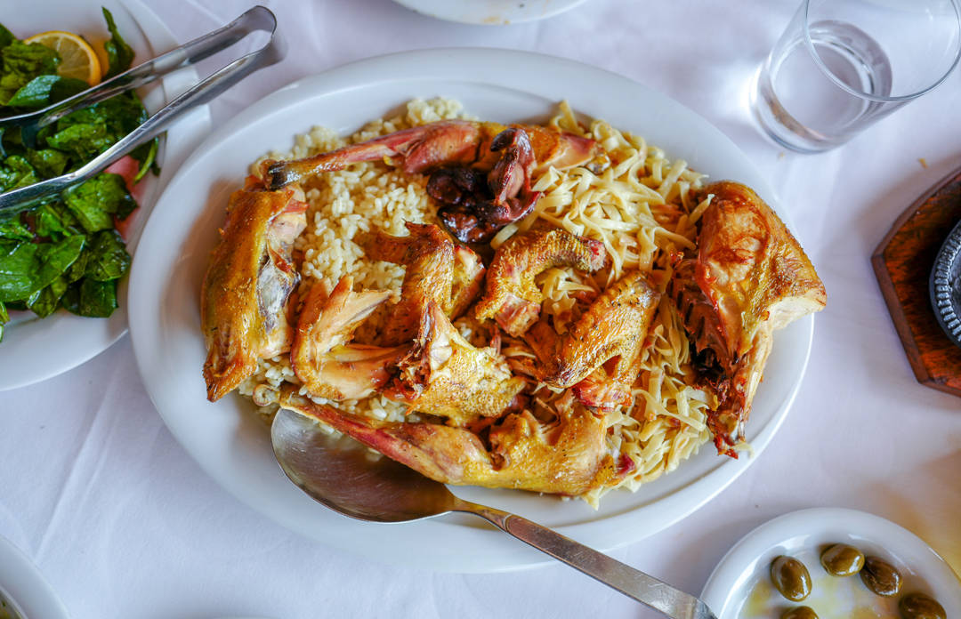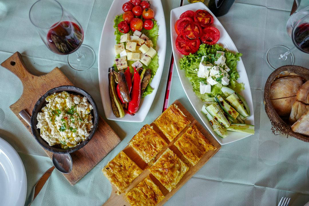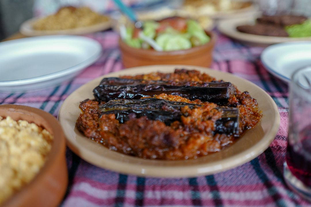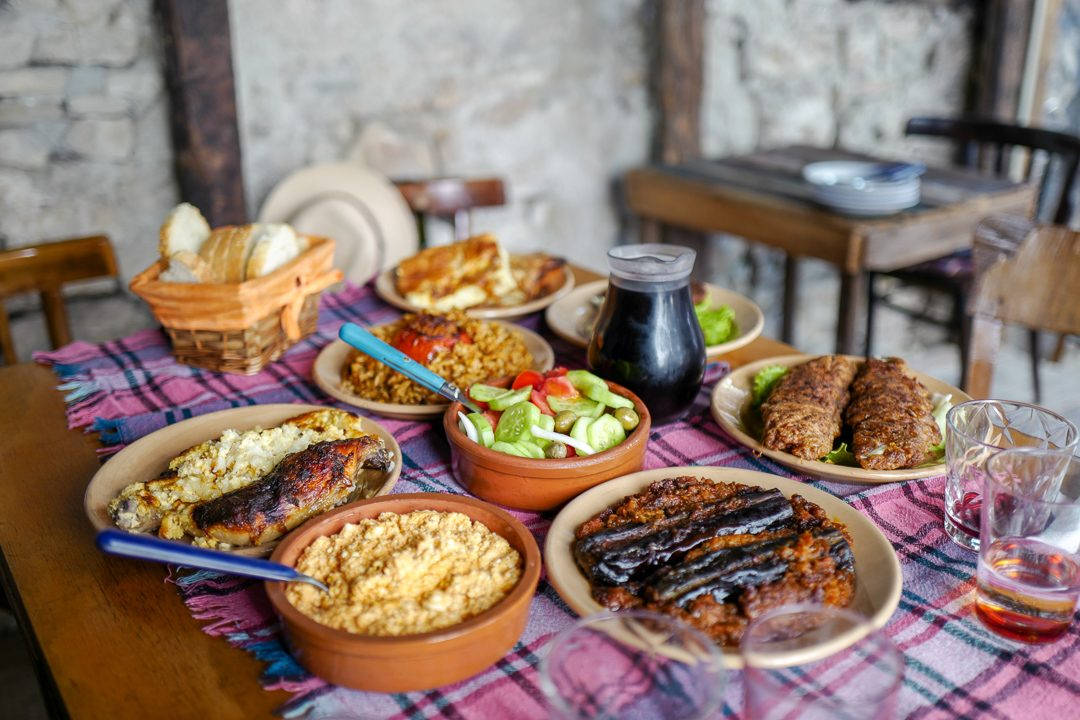 Imam Bayildi er en nydelig rett med bakt aubergin som jeg forelsket meg helt i. Vi får börek og den deilige retten Ferges som består av den albanske fetaosten som jeg nevnte ovenfor kokt med tomater, løk, paprika og chili. Det bæres inn ostefylte svinerulader og risretter med bakte, fylte tomater. Også den klassiske salaten med tomater og agurk står på bordet i den koselige lille bakgården.