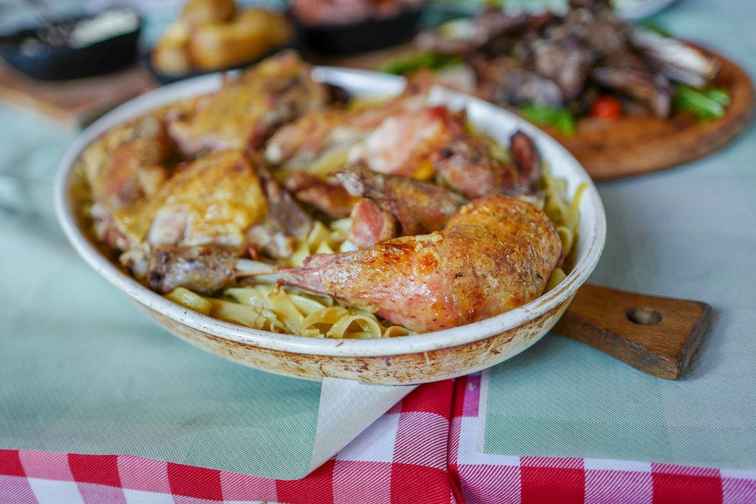 Pastadeigen er laget med durumhvete, melk, egg og salt. Den serveres ofte med helstekt kylling. Saftene fra kyllingen trekkes opp av pastaen og smaker derfor helt magisk! Denne retten får du over hele landet.