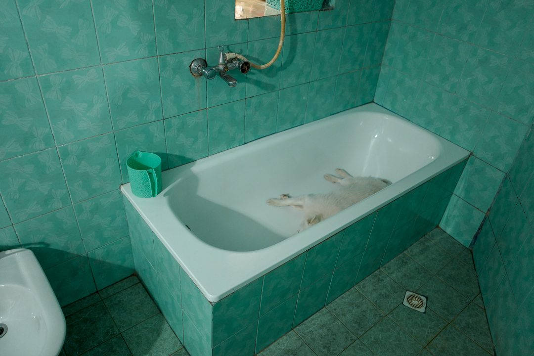 Det er inne i huset og du må ikke bli forundret hvis du støter på familens hund som ofte tar en liten lur i badekaret.