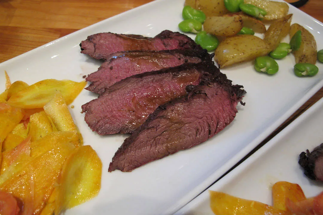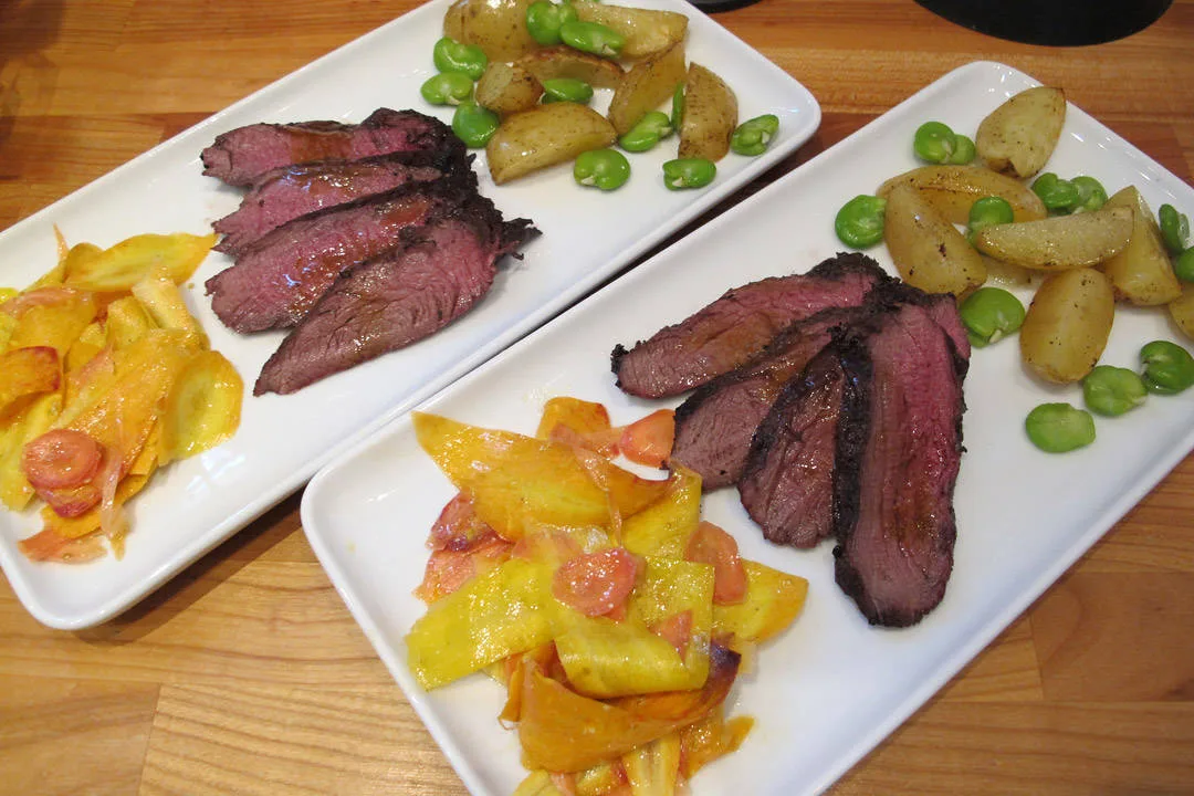 Helgrillet indrefilet av elg med bønner, poteter og gulrotsalat med anisvinaigrette og en deilig saus av akevitt: