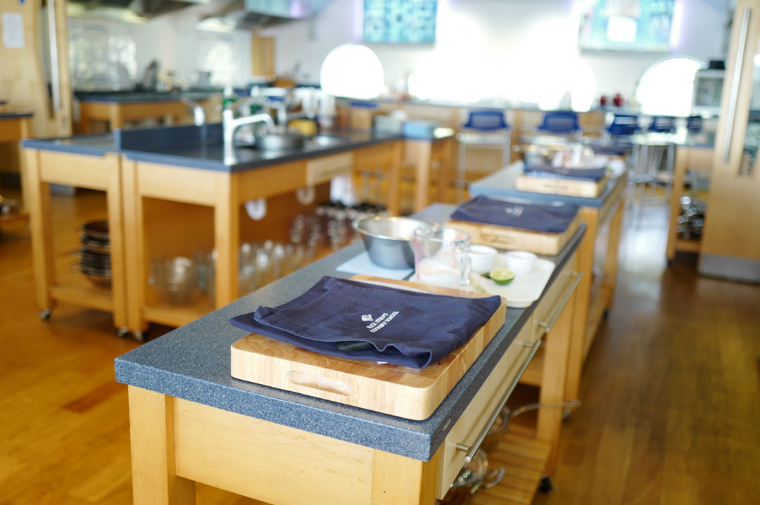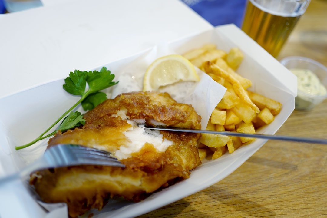 Vi spiser retten vår og er passe stolte over innsatsen i kjøkkenet. Dette er første del av lunsjen. Vi går ned en etasje til Rick Stein’s Fish & Chips. Dette er en 2 millioner punds-bedrift. De bruker kun friske råvarer, hjemmelagde sauser, hjemmelaget chips fra egen poteter. Rick Stein har til og med laget eget øl oppkalt etter hunden hans Chalky’s.