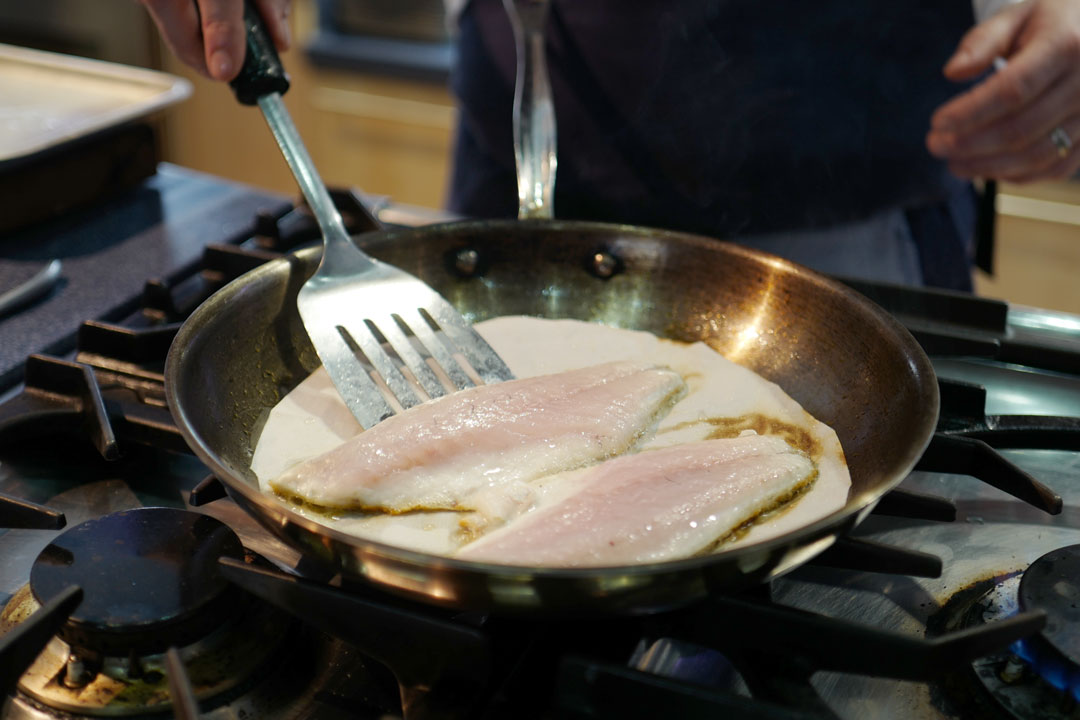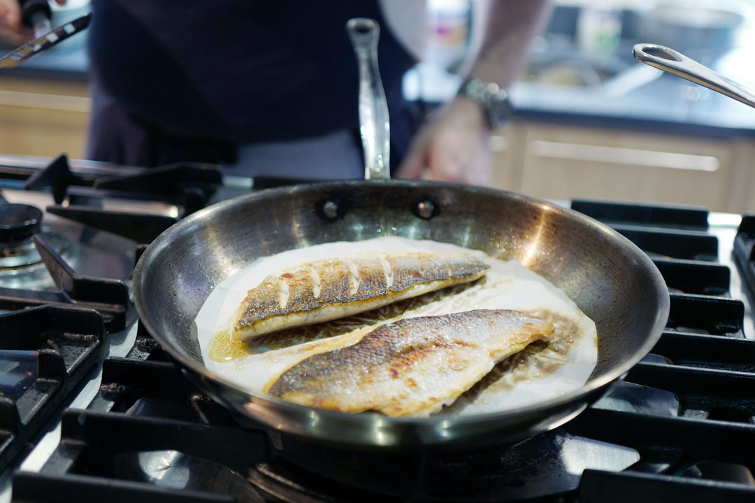 Vi lærer også en smart måte å steke fisk på. Kokken Nick klipper til en sirkel av et matpapir som tåler varme. Så salter og peprer han fisken og oljer den (aldri olje i pannen, sier han) og så legger han fisken på papiret med skinnsiden ned når pannen er skikkelig varm. Dette gjør at fisken ikke setter seg fast i pannen. Han presser fisken lett ned i pannen med en stekespade. Når skinnet er sprøtt snur han fisken og steker kjapt på den andre siden. Nå er fisken ferdig.