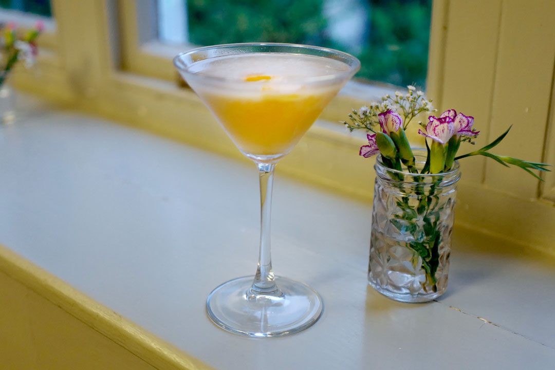 Vi får servert Cornish Breakfast Martini laget av lokal gin, Cointreau, sitronsaft, eplejuice og appelsinmarmelade.