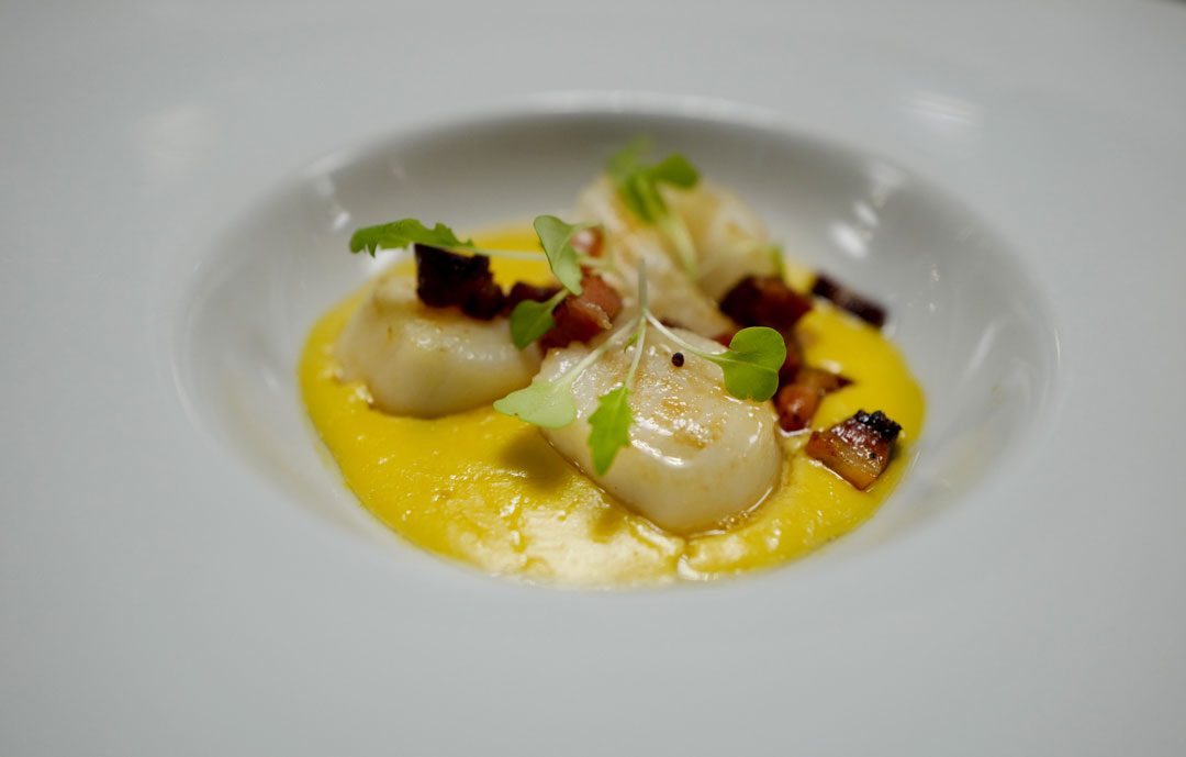 Første rett er nydelige kamskjell med maispuré og panchetta.