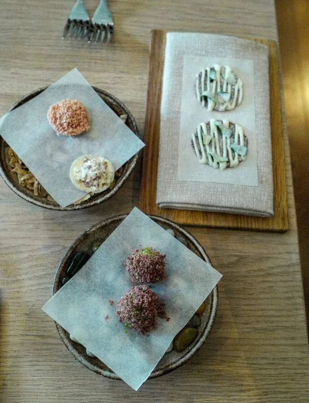 Snacks: Potetpannekake med østersemulsjon, terte av jordskokk, reddik i perseillekrem med revet lammehjerete.