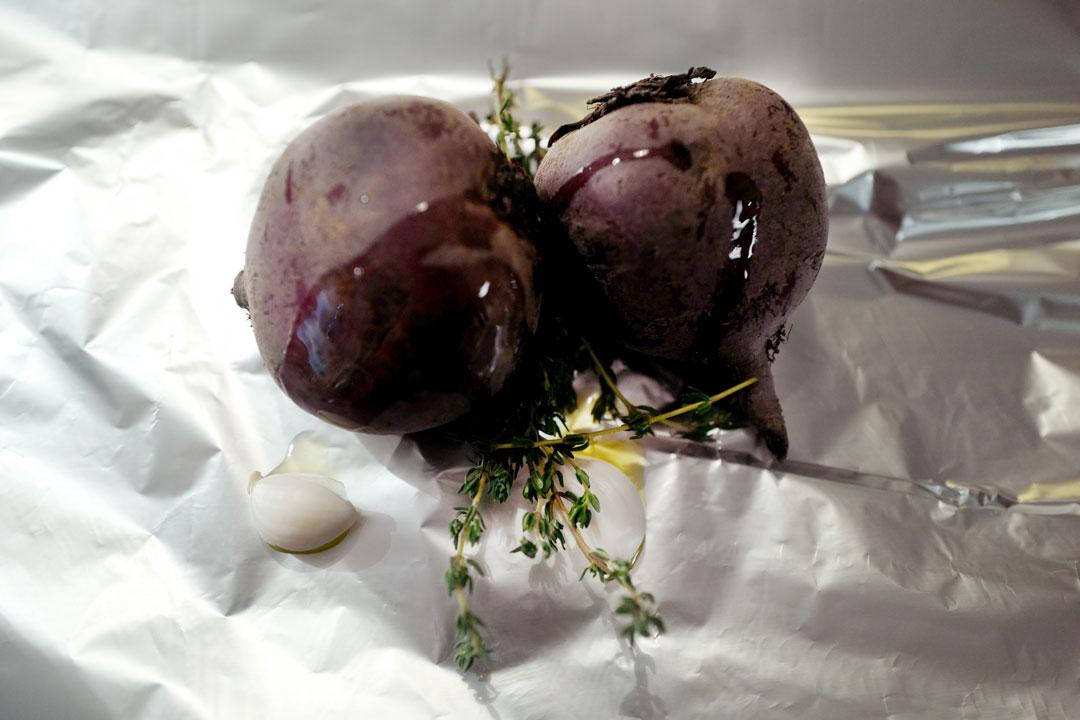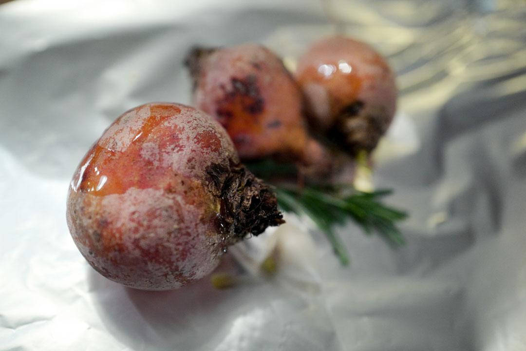 Baking: Start med betene som skal bakes. Pakk dem inn i aliminiumsfolie sammen med en kvist urter (timian i den ene og rosmarin i den andre) og et hvitløksfedd. Hell bittelitt olivenolje over. Pakk godt inn og hiv dem i glørene i peisen eller i ovnen på 230 grader. La «pakkene» ligge til grønnsakene er myke (kjenn med fingrene ved å klemme på pakkene). Det kan ta en god time eller mer. Det kommer an på størrelsen på grønnsakene. Du kan med hell bake betene timer i forkant før du skal servere dem.