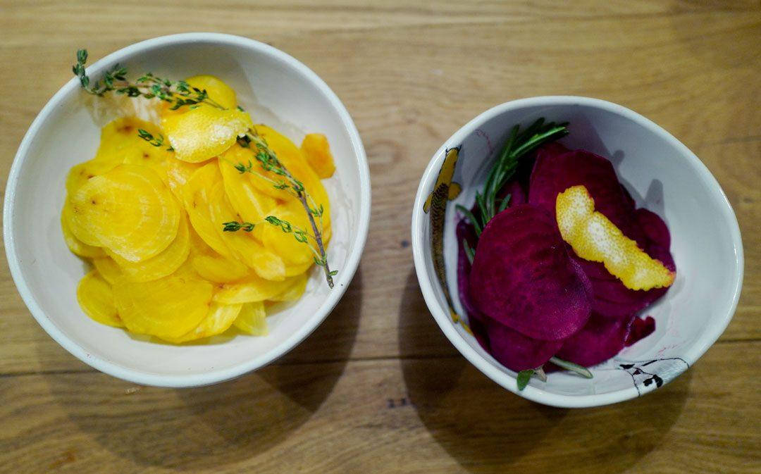 De skrelte betene skjæres tynt med en potetskreller eller mandolin. Legg gule beteskiver i en skål og rødbeteskiver i en annen skål. Legg en kvist urt i hver skål samt en strimle sitronskall. Fordel syltevæsken i de to skålene og la stå på kjøkkenbenken en times tid. Sil av og skyll i kaldt vann før du tørker skivene.