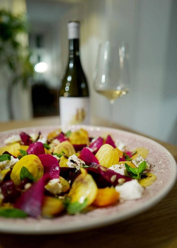 Vintips: Nydelig sør-afrikansk vin fra produsent B Vintners Strandwolf Chardonnay 2015. Det kan være vanskelig å finne viner til grønnsaksbaserte retter, men denne syntes vi satt som et skudd!