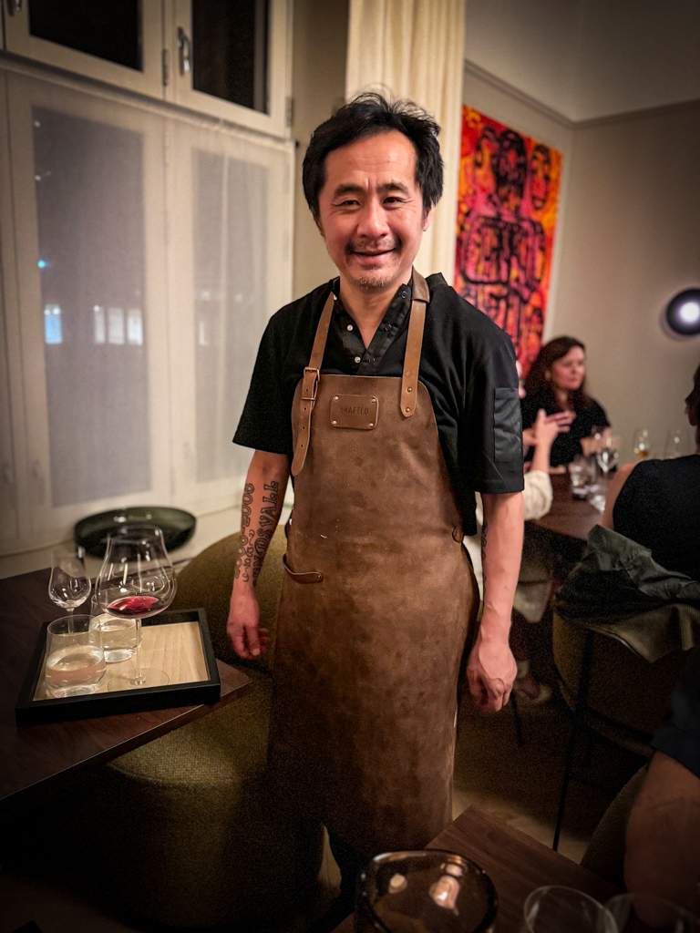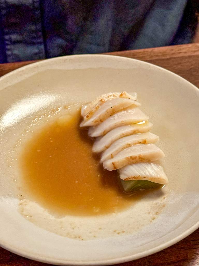 Kamskjellet fra Trøndelag er tilberedt helt perfekt. Men den delikate smaken drukner i sprø purre. Dashien er nydelig og umamirik. Den hadde tjent på å bli skjenket i skålene ved bordet for når den ankommer gjestene er kraften “all over the place” og lager et søl på de flotte tallerknene. Björn er nok ikke enig med meg om purren. Den skal gi krønsj til retten, men et blikk over på nabobordet bekrefter nok det jeg reagerer på: Den tar for mye plass i det delikate smaksbildet og den ligger igjen på tallerken. Dessuten har Erik og jeg to helt forskjellige konsistenser på purren. Min kan tygges ganske greit, mens Eriks er fra et tøffere sted av purren.