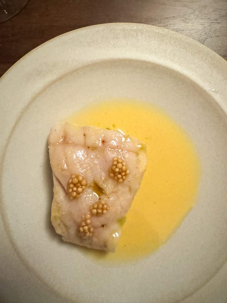 Uer med syltede sennepsfrø er retten. Våre to porsjoner er langt fra identiske i utseende og mitt stykke er i overkant fast og tørt. Ikke alle kokker synes det er en god idé å bruke tid på å sause ved bordene, men her hadde det igjen vært en god idé. Ikke bare for utseendets skyld, men som en hyggelig gest.