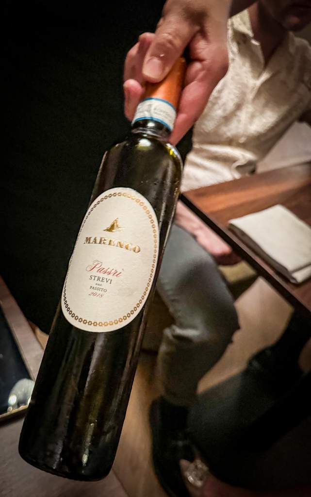 Dessertvin av druen Brachetto skjenkes til desserten. Blåbær, granis og brunost er en perfekt dessert. Behagelig smak av granskudd med pop av friske bær og revet brunost. Et godt bevis på at få ingredienser og enkel presentasjon kan fungere utmerket.