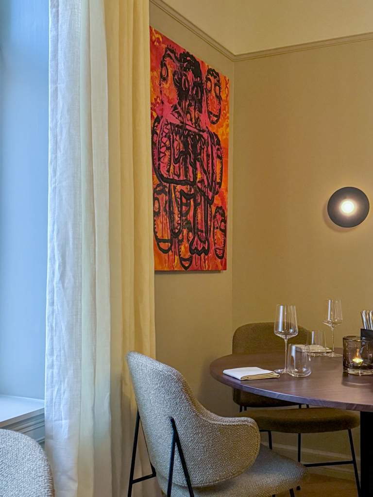 Det er ikke lett å finne inngangen og vi blir stående sammen en gjeng med andre gjester for å lete etter ringeklokken. En gjest ringer til restauranten, og vips er vi inne i oppgangen. Inn til høyre er den anonyme og tildekkede glassdøren til Fan. Vi geleides til bordet i mørkt treverk som står klart. Møblene er i beige-grått stoff og ganske behagelige å sitte i. Veggene er malt i brun-beige og i taket henger det matte lysekroner. Veggene er dekorert med bilder av kunstner Bjarne Melgaard. Man kan mene hva man vil om Melgaards stil og jeg er ingen personlig fan av akkurat den. Jeg er heller ikke fan av “Få hotellstilen hjemme” som jeg dessverre synes restaurantens interiør bærer preg av. Upersonlig og uinspirert. Vinduene er dekket til og lyset særdeles “soft” i lokalet.