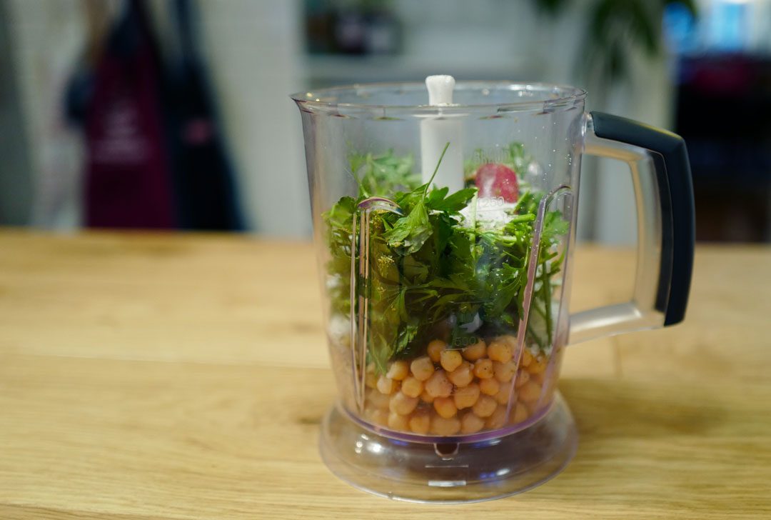 Kjør alt dette i blender til en grov konsistens. Spe med mer mel hvis du vil ha deigen fastere.