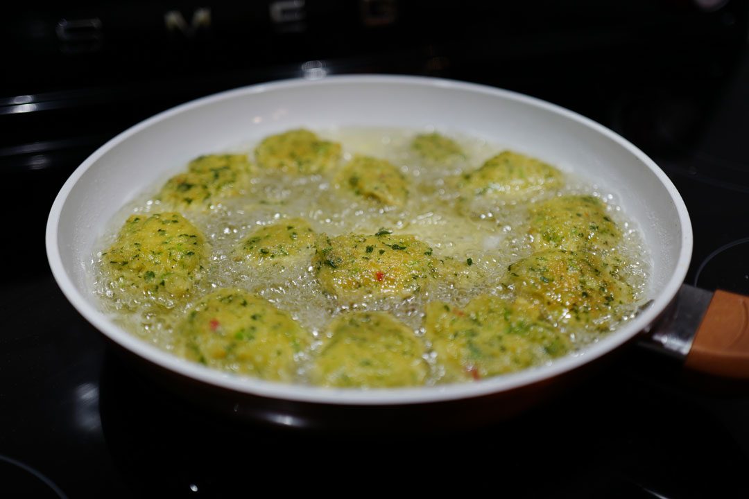 Varm en høy stekepanne og fyll den halvveis med nøytral olje. Når oljen er varm former du små boller av deigen og legger dem i oljen. Snu dem etter noen minutter når der er gylne.