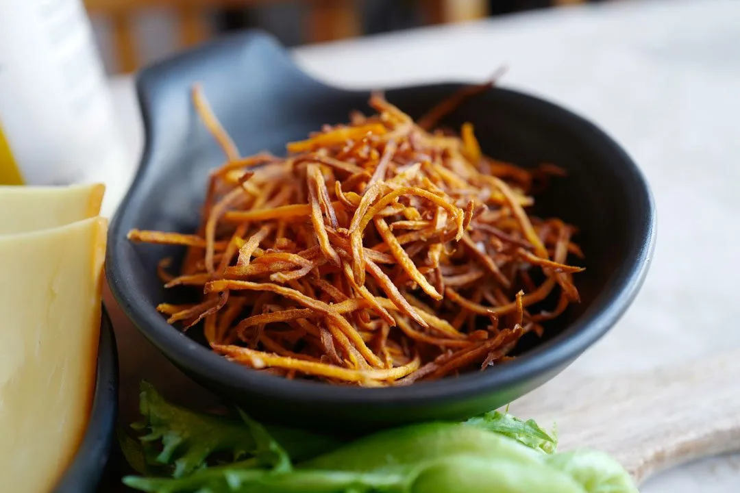 Søtpotetkrønsj: Jeg er glad i krønsj og vil gjerne tilføre burgeren min litt ekstra. Sprø søtpotet er tingen. Jeg lager tynne juliennestenger av søtpotet, friterer dem og legger den på toppen under burgerbrødtoppen.