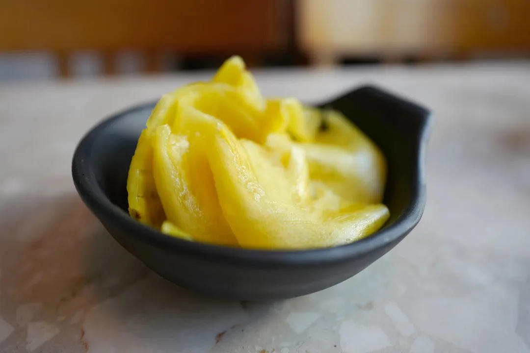 - Skjær tynne skiver av ananas, gjerne med en mandolin. Legg skivene i syltelaken minimum 30 minutter og gjerne natten over.