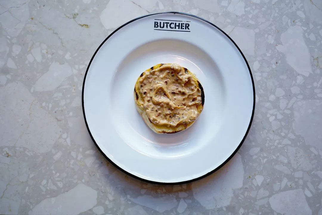 - Grill begge flatene på burgerbrødet. Legg underdelen på et fat.