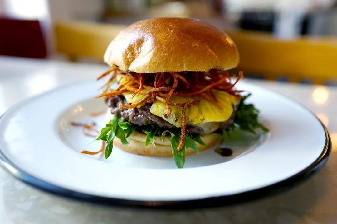 Syltet ananas: De syltede, tynne skivene av ananas er lagt på en enkel syltelake med eddik, vann, sukker og litt salt. Man trenger et syrlig element for å skjære igjennom fettet som finnes i burgeren. Mange velger sylteagurker. Jeg viderefører ananaselementet mitt ved å sylte ananas.