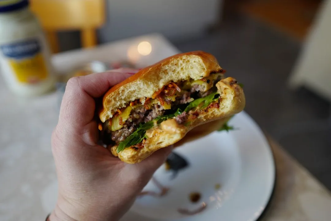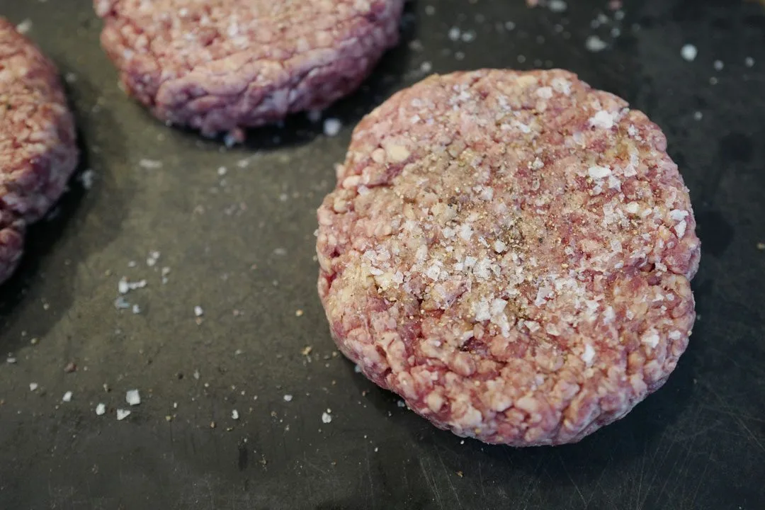 Det kvernede kjøttet gjør jeg lite med. Fint kjøtt skal formes forsiktig til burgere. Ca 170 g per person. Jeg salter og peprer overflaten lett. That’s it. Jeg misliker løkbiter og morsomt krydder i hamburgeren min. Det kan heller komme som tilbehør. Ikke i burgeren min. Jeg liker at man smaker det gode kjøttet.
