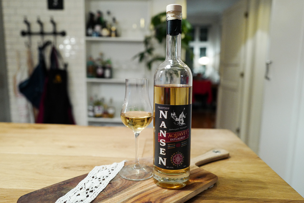 Nansen Aquavit. Jeg er enig med Stig Bareksten om at dette er en akevitt som passer godt til fisk. Den er rund i munnen og kryddersmaken er jevn. Det er ingen krydder som stikker seg frem og tar for mye plass. Jeg er fan av denne.