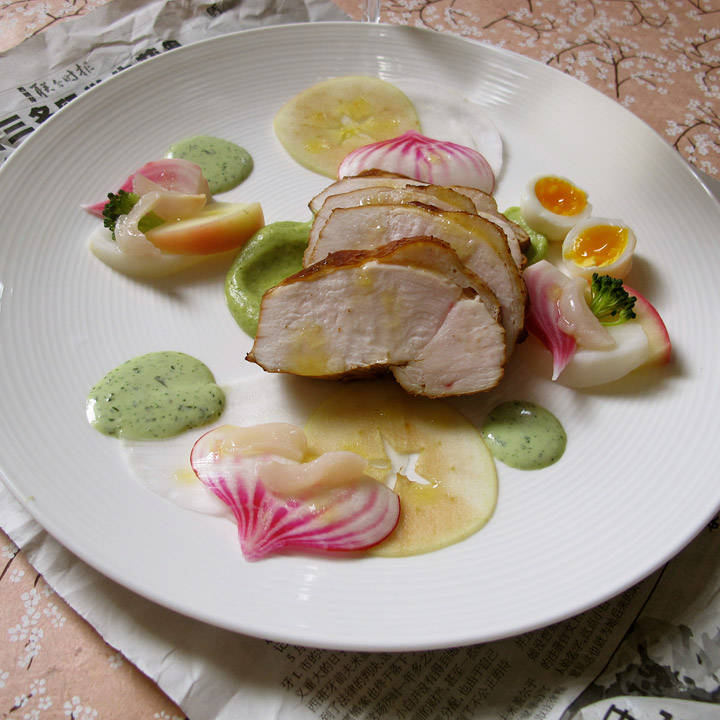 Jeg går for en rett med teknikker jeg har brukt en del den siste tiden: Kyllingbryst (fra Gaardsand i Vestfold) posjert i en asiatisk masterstock og senere terøkt i en røykboks på verandaen. Tilbehøret er norske neper, (Åkerø-epler) og økologiske polkabeter (fra Korsvold gård i Østfold) servert på to måter, Brokkolipuré, vaktelegg og thaibasilikum-majones. Alt dette servert med en mango/litchi/chiliglace.