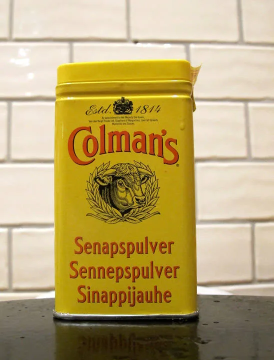 Det er laget av finmalt sennepsfrø. Jeg gnir kjøtt inn med det for å få en dypere og mer intens smak når jeg steker kjøtt i ovnen. Ja, jeg gnir til og med ribba inn med det. Coleman’s sennepspulver får du i større matforretninger. Prøv det og merk forskjellen.