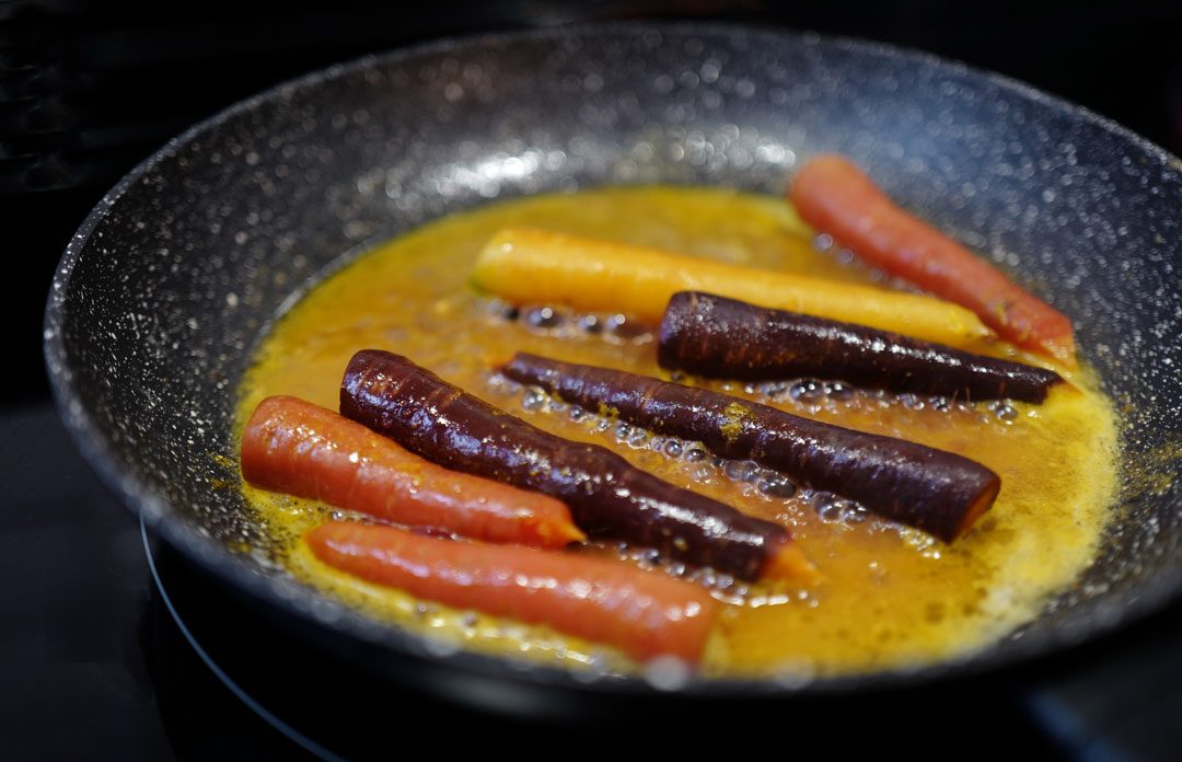 Gulrøttene legger jeg i en stekepanne med saften fra to blodappelsiner (eller vanlige appelsiner). Hell på 4 cl anisbrennevin som Ouzo eller Pastis. Tilsett 3 ss smør og et helt hvitløksfedd. La dette kose seg i pannen på medium temperatur. Mens dette koser seg renser du en liten neve små oliven med stein. Skjær kjøttet løs med en liten kniv. Legg olivenbitene i pannen sammen med gulrøttene. Når sausen rundt gulrøttene er litt klissete er det ferdig.