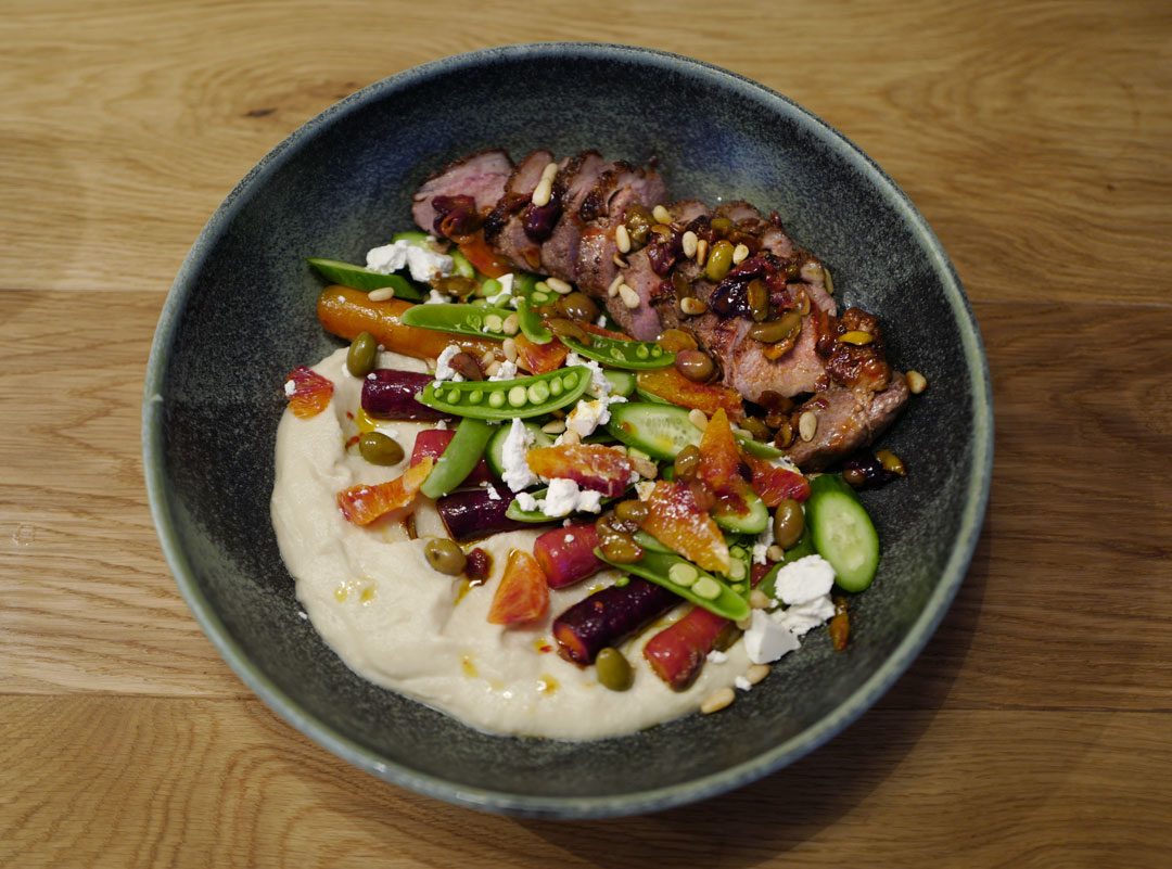 Lammet jeg har laget kan man kanskje si er en moderne greskinspirert rett. Jeg har fetaost, oliven, agurk, pinjekjerner og appelsin. Men jeg har også gulrøtter og jordskokk. Mange elementer, men jeg synes det passer godt sammen.