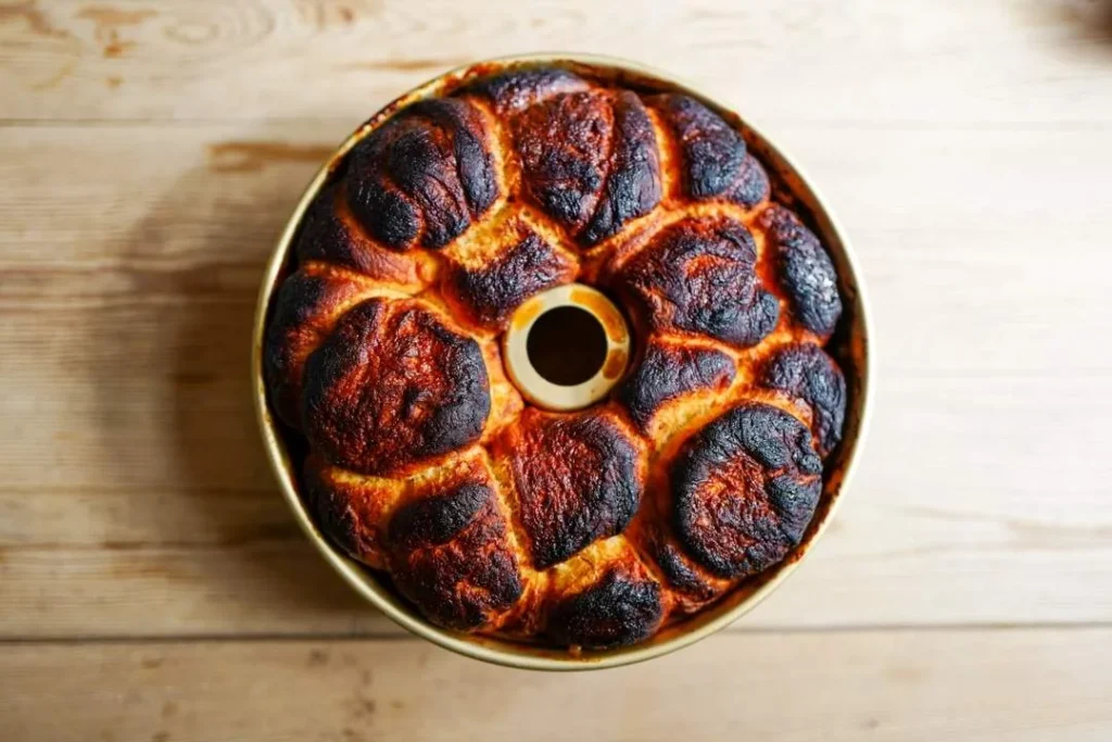 Smør en form. Smelt smør, sukker og kanel i en gryte. ca 80 gram smør, 80 g sukker og en teskje kanel. Vend alle bollene i denne blandingen og legg lagvis i formen. Sett til heving i 30 minutter. Pensle litt mer av sukker/smør-blandingen over bollene og stek på 200 grader i ca 30 minutter. Sjekk når det har gått 20 minutter hvordan det ligger an. Jeg dro den nok litt langt slik at skorpen ble litt tørr. Selv om fargen på baksten blir mørk, er den ikke nødvendigvis brent. Det er sukker og kanel som gir fargen.