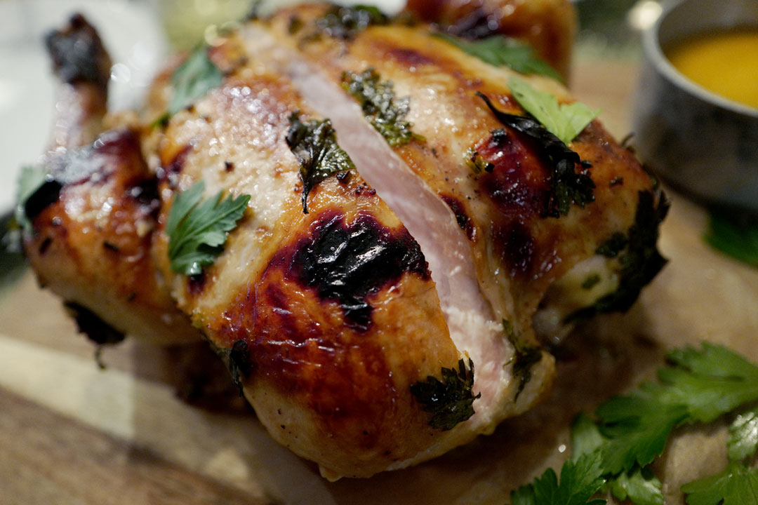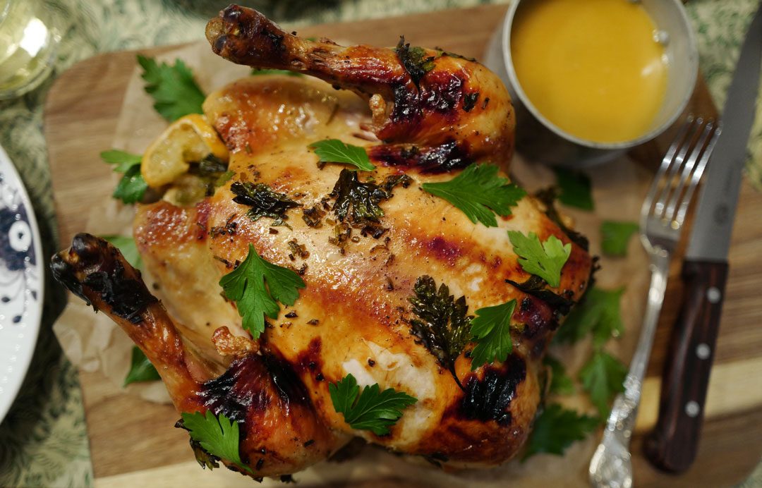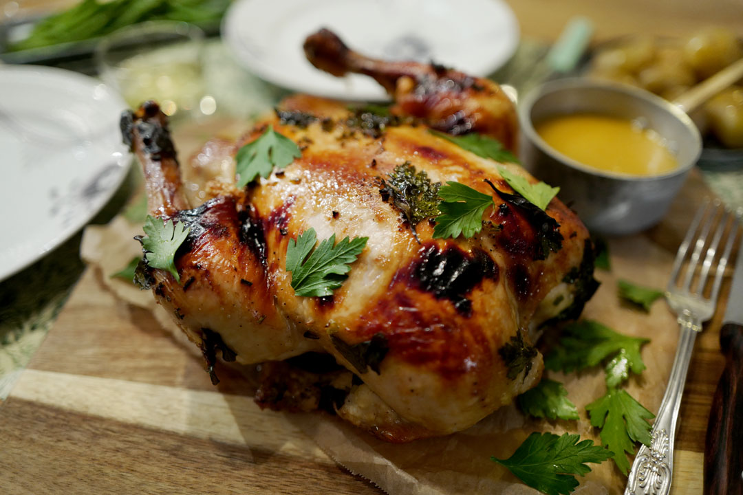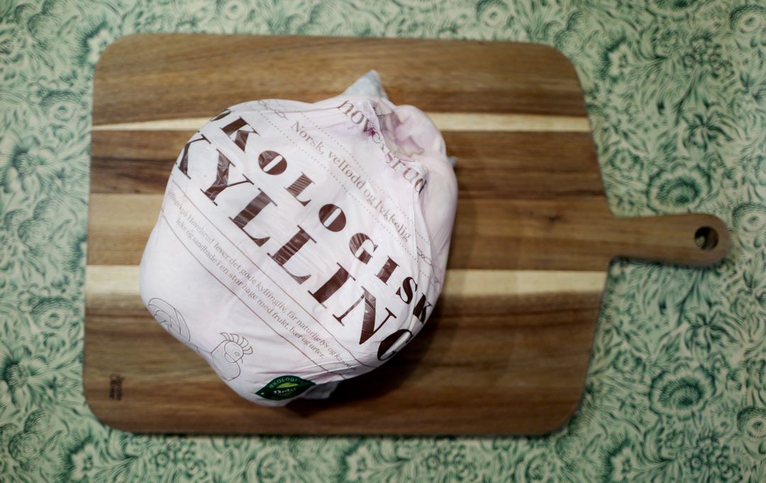 En slik kyllingstek er den ultimate søndagsmiddagen og hvis du vanligvis ikke tilbereder hel kylling, bør du seriøst vurdere det. Jeg kjøpte en økologisk kylling fra Hovelsrud. Den var på nesten tre kilo og koster nesten 300 kroner på Kiwi. Ja, noen av Kiwi-butikkene har den i sortementet sitt. Det samme har Maschmann og Gutta på Haugen.
