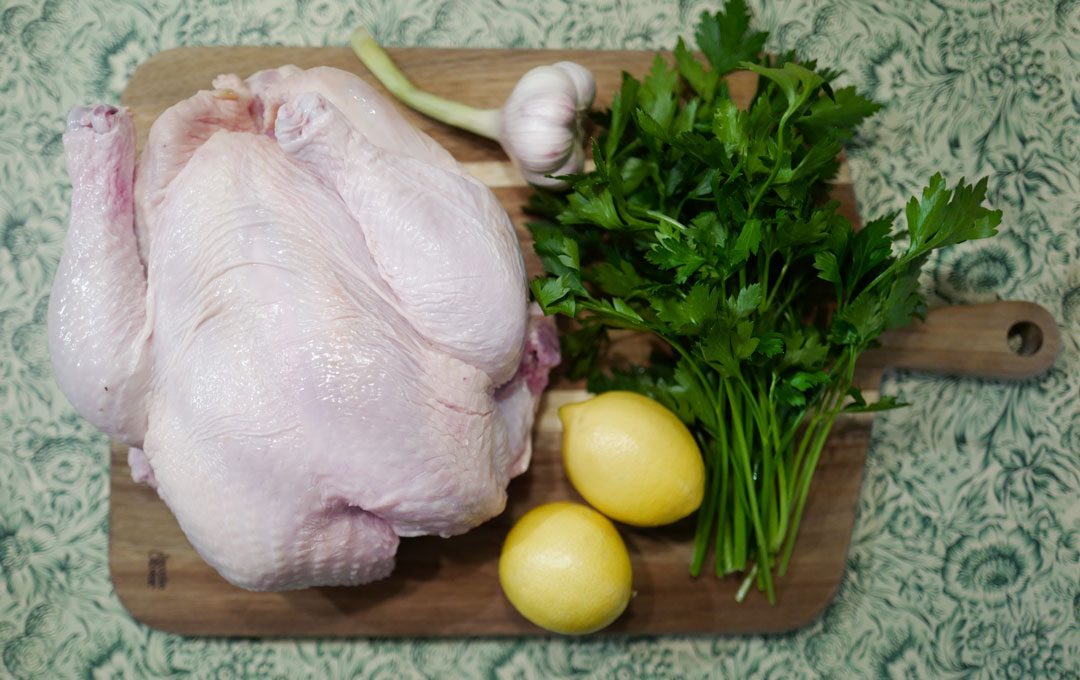 Jeg legger skiver av sitron i buken på kyllingen og på selve kyllingen. Hvitløksfedd legger jeg rundt. Jeg hakker stilkene av 4-5 persillekvaster. Disse strør jeg over kyllingen. Bladene legger jeg også i gryta.