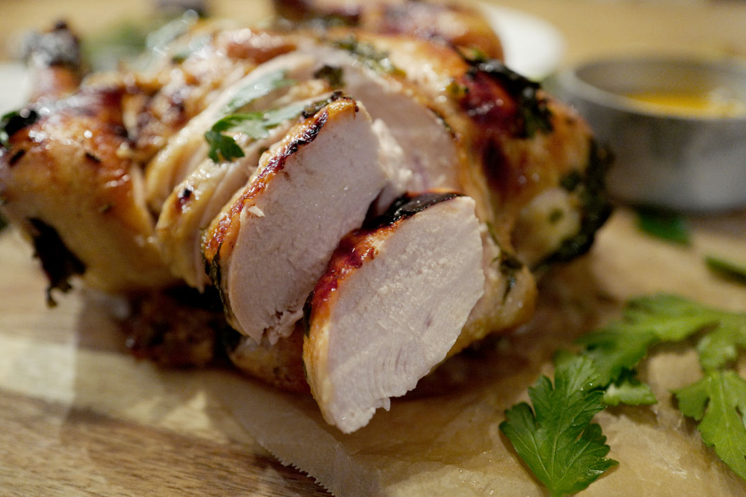 Helstekt kylling er en perfekt rett å server når man setter seg ned ved et søndagsbord. Fordi denne kyllingen er stor sammenliknet med andre hele kyllinger som man får kjøpt, er den også lettere å steke uten å tørke ut. Som du sikkert vet er det viktig at brystkjøttet ikke blir tørt. Men det er også viktig at lårkjøttet ikke er rått. Jo mer kjøtt på kyllingen jo lettere er det å få den gjennomstekt uten at den tørker ut. Det er min erfaring.