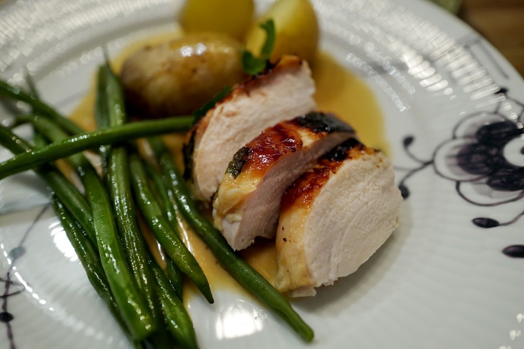 Kok fine, små poteter og aspargesbønner. Hakk bladpersille og dryss over. Server med rikelig av den deilige sausen. Legg kyllingen på fjøl og skjær langs brystbenet. Skjær ut brystfileten og skjær den igjen i fine stykker. Gjør det samme med brystfilet nummer to og når du kommer til lårene skjærer du skiver til du treffer beina.
