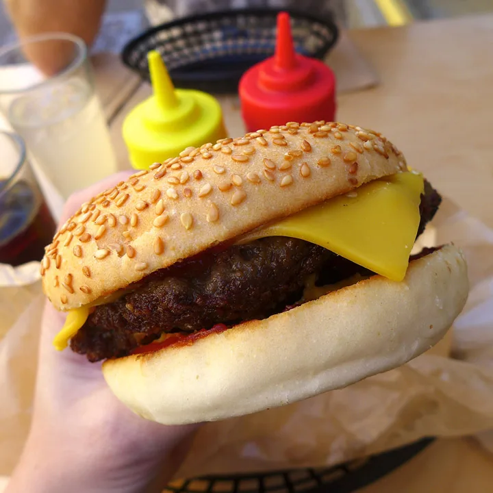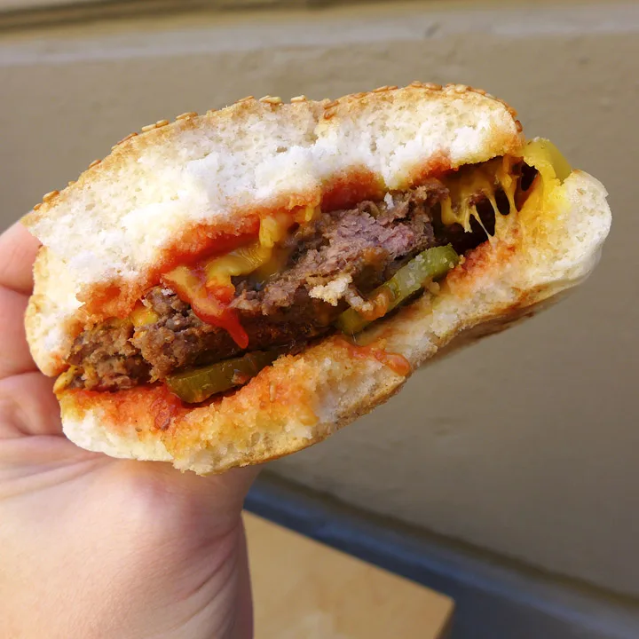 Jeg hadde en klassisk cheeseburger med sylteagurk, sennep og ketchup og selvsagt cheddar-ost.