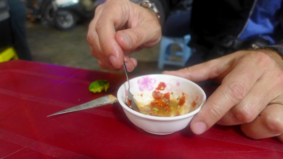 Det første jeg vil legge ut er en klassisk vietnamesisk dipp (Muoi Tieu Chanh) som du får til nesten alt der borte. Prøv den til skalldyr, grillet kjøtt eller fisk. Dette er en dipp du lager selv ved bordet og som er individuell. Den består av chili, lime, salt og pepper. That’s it.